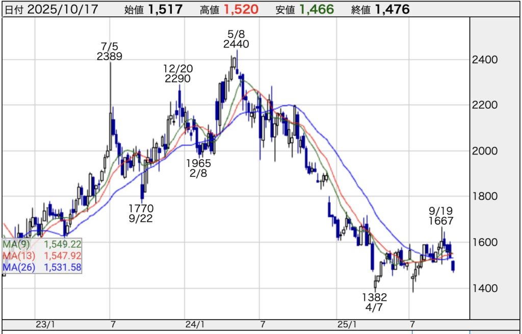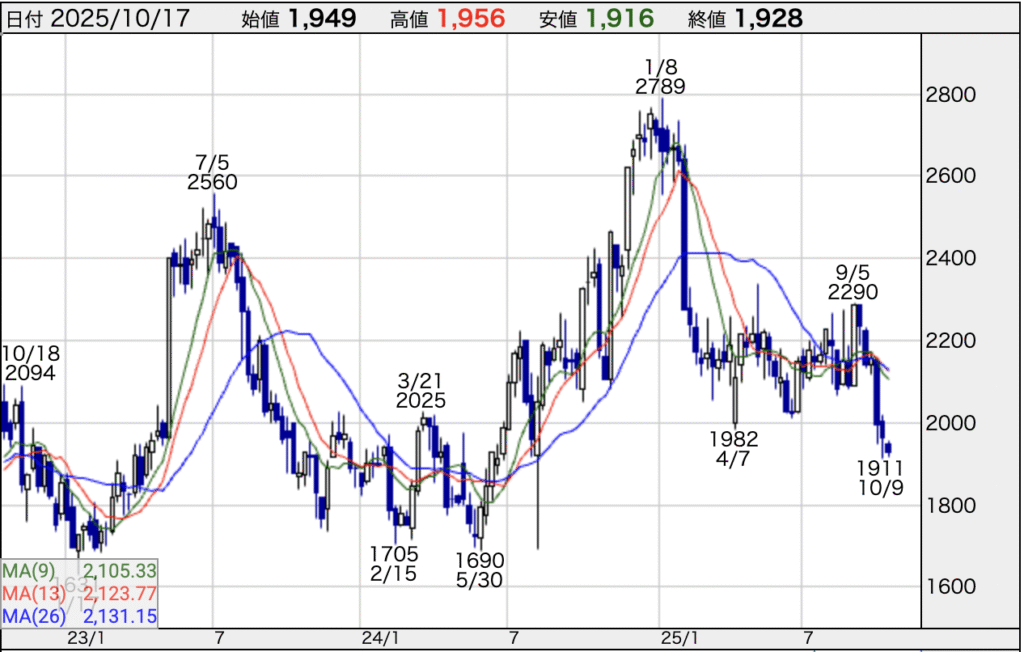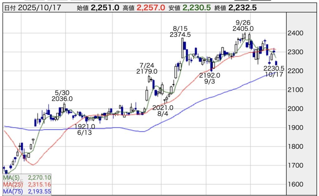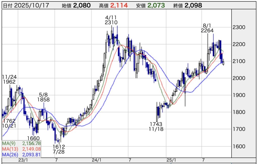 2025年10月18日現在の株価は1,928円、PER10.5倍、 PBR1.40倍、配当利回り3.84%となっています。株価は割安と言うほどではありませんが、購入するにはまずまずの数値かなと思います。