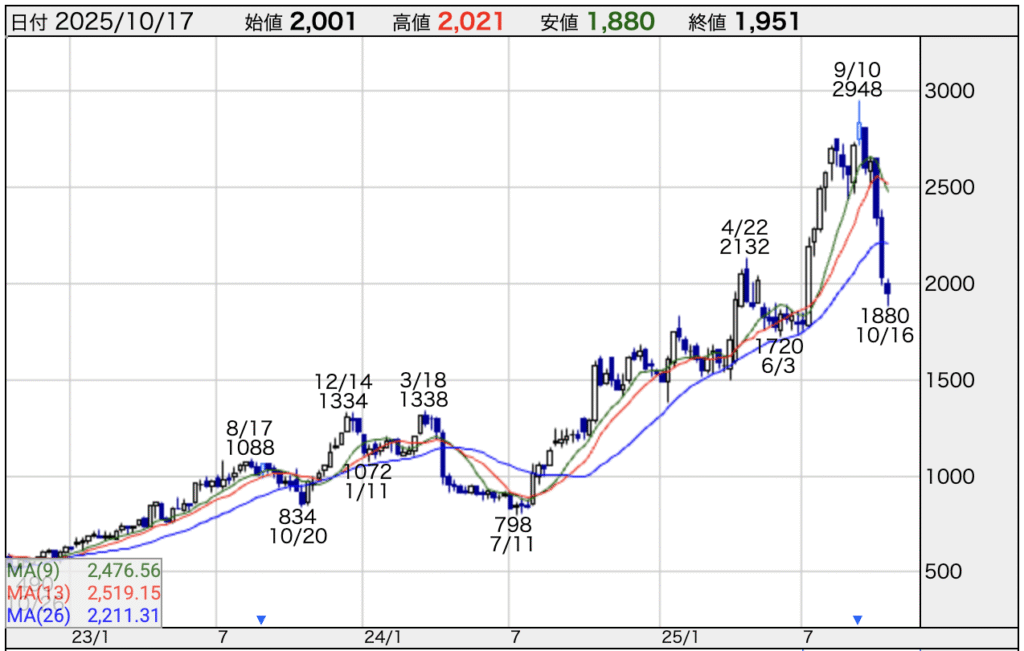 現在の株価は1,951円、PER20.1倍、PBR4.53倍、配当利回り1.54%となっています。株価は割高ですが、一時期に比べだいぶ株価を下げてきました。