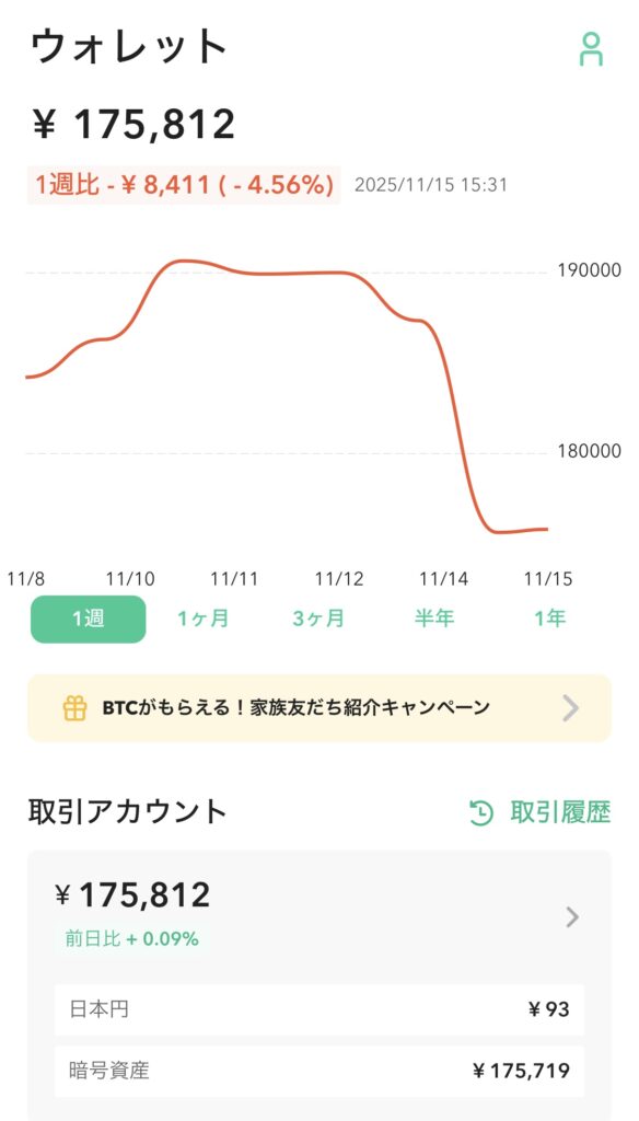 元金20万円で始めたビットコイン投資ですが、現在175,812円まで下落😂