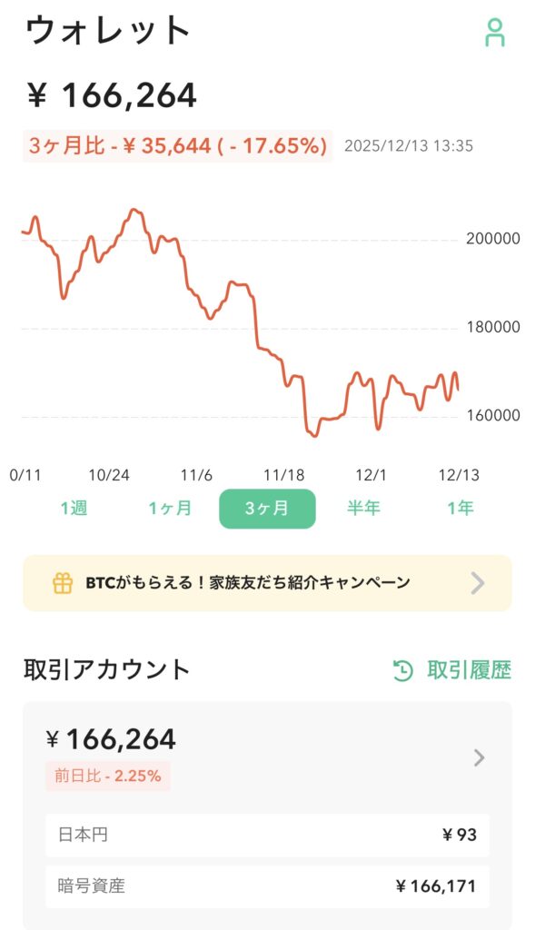 ⏫「コインチェック」で運用中のビットコインです。投資額は20万円で、現在の価格は約166,000円です😂