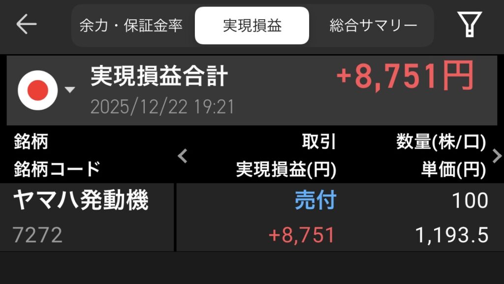 ⏫ヤマハ発動機は400株持っていたため、100株売却しました。300株保有で株主優待がグレードアップします。