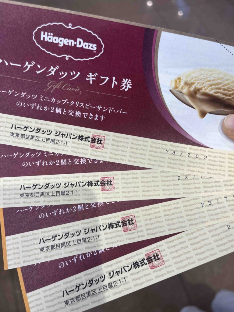 権利確定月は3月と9月で、1回につき4枚もらえます。1枚で2個のハーゲンダッツと交換できるので、年間で16個のハーゲンダッツが食べられます。
