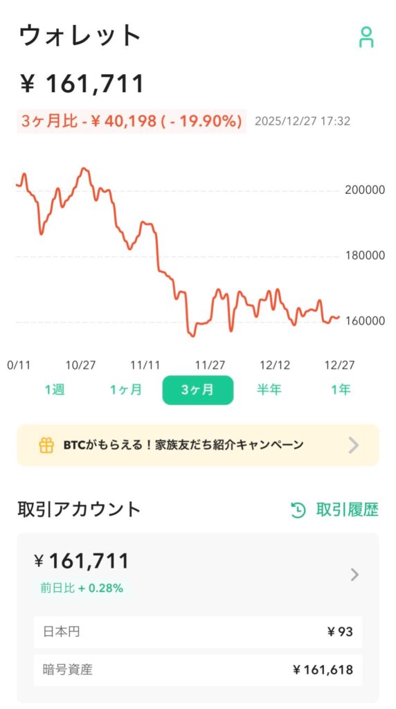 ⏫「コインチェック」で運用中のビットコインです。投資額は20万円で、現在の価格は約162,000円です😂
