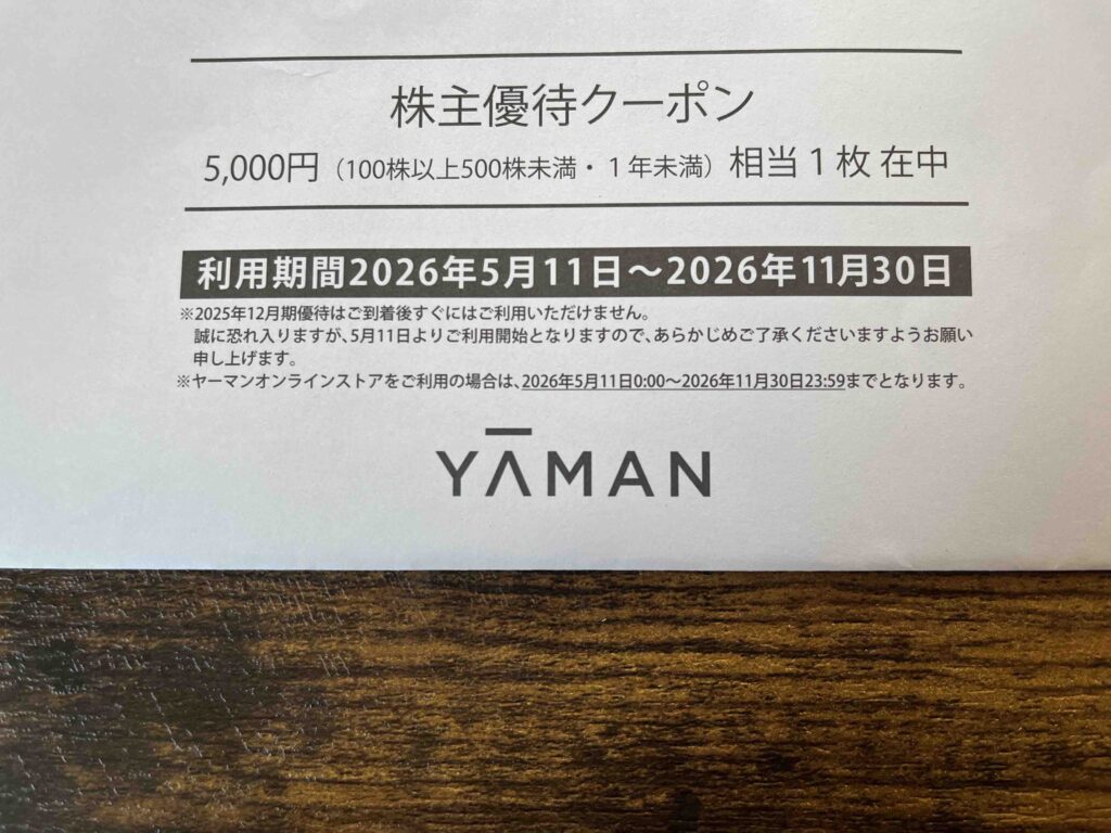 ⏫ヤーマン(6630)からいただいた株主優待です。自社直販Webサイトなどで使用できるクーポンで、保有年数に応じて優待内容がグレードアップします。