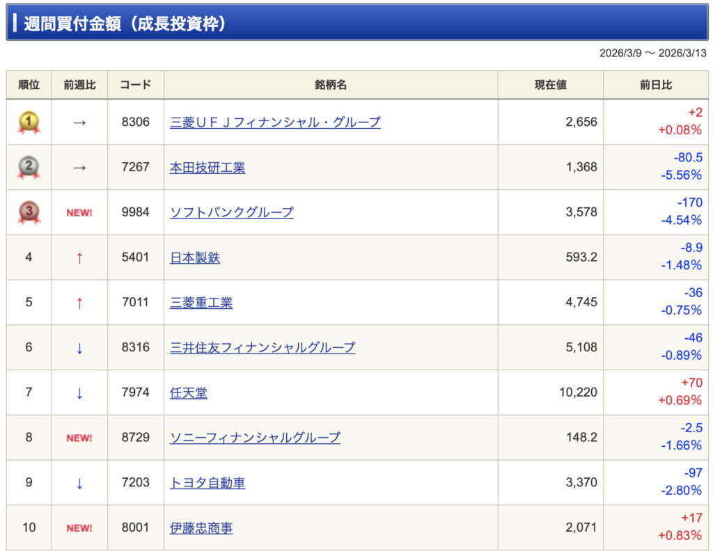1位は三菱UFJでした。今週は株価が下落し、約2ヶ月ぶりの安値を付けたことで、押し目買いが入ったようです。