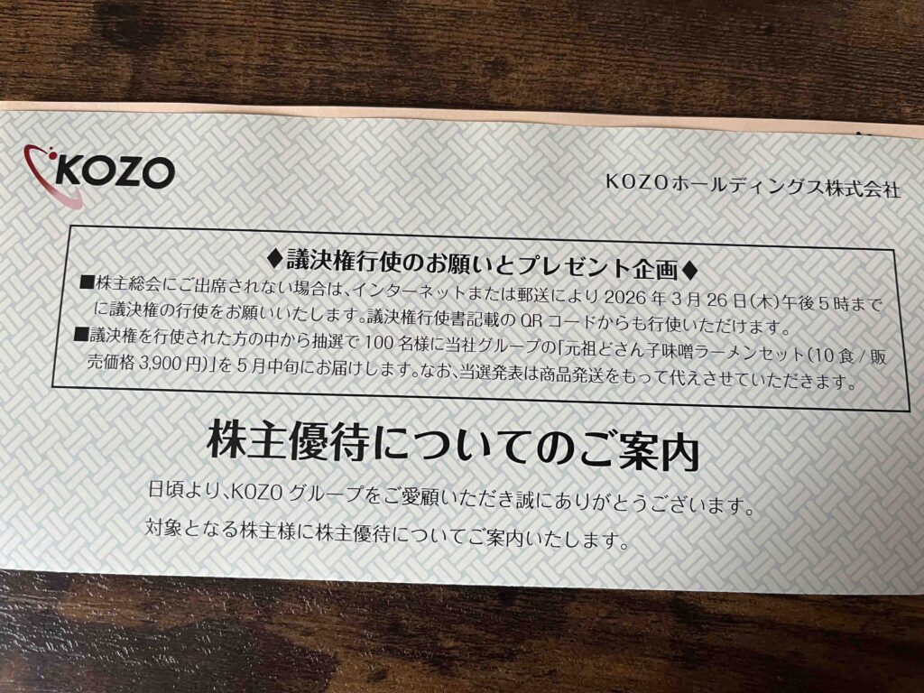 ⏫KOZOホールディングスの株主優待です。500円分の食事優待券です。