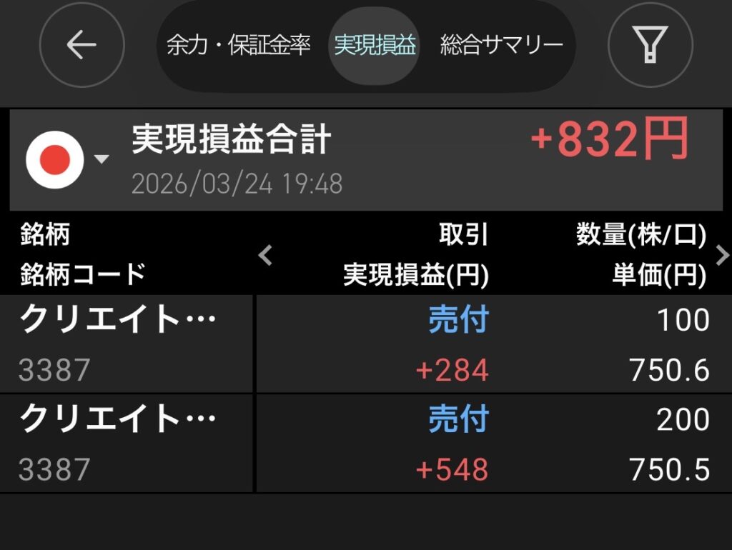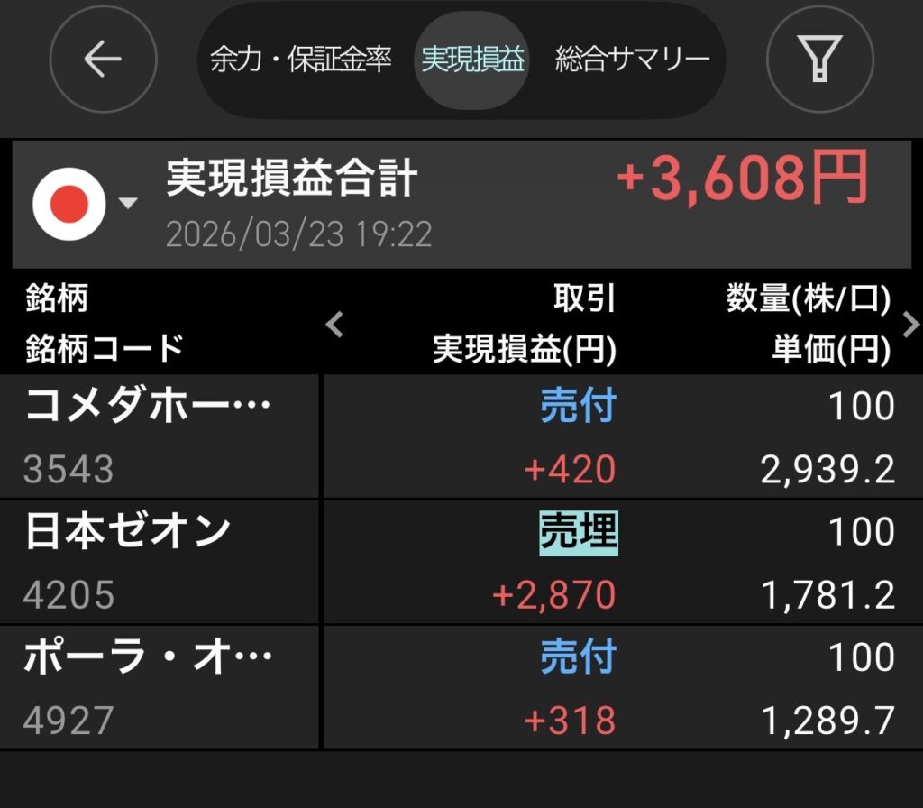 ⏫現金を確保するために保有株を売却しました。日本ゼオンはデイトレです。