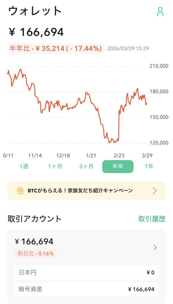 ⏫投資元本は24万円で、現在の評価額は約16万6,000円です。ビットコイン価格は、しばらく軟調な動きが続くかもしれません…。