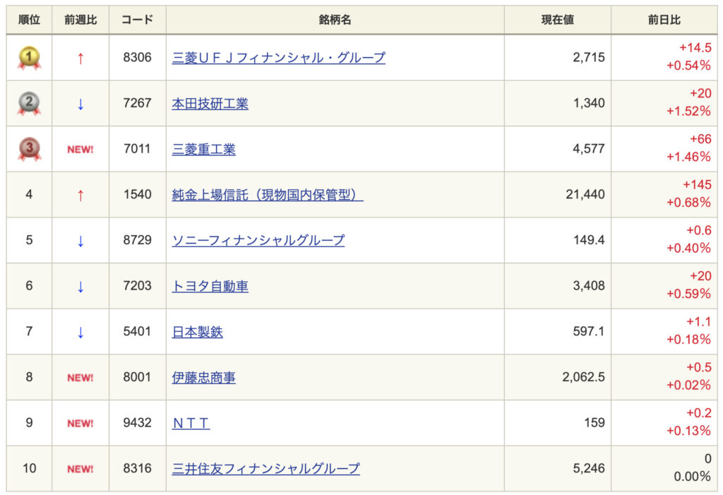 1位は三菱UFJフィナンシャル・グループでした。今週は一時的に株価が大きく下落する場面があり、そうした局面で買いが入ったようです。