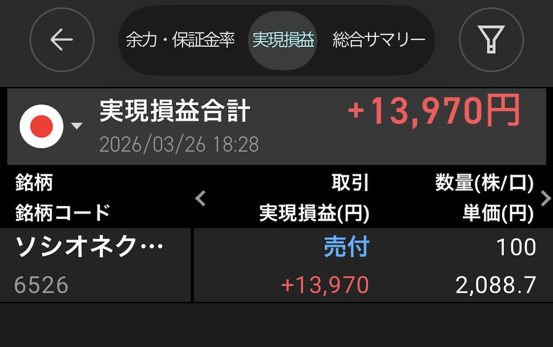 ⏫この日はソシオネクストが急騰したため、利確しました。