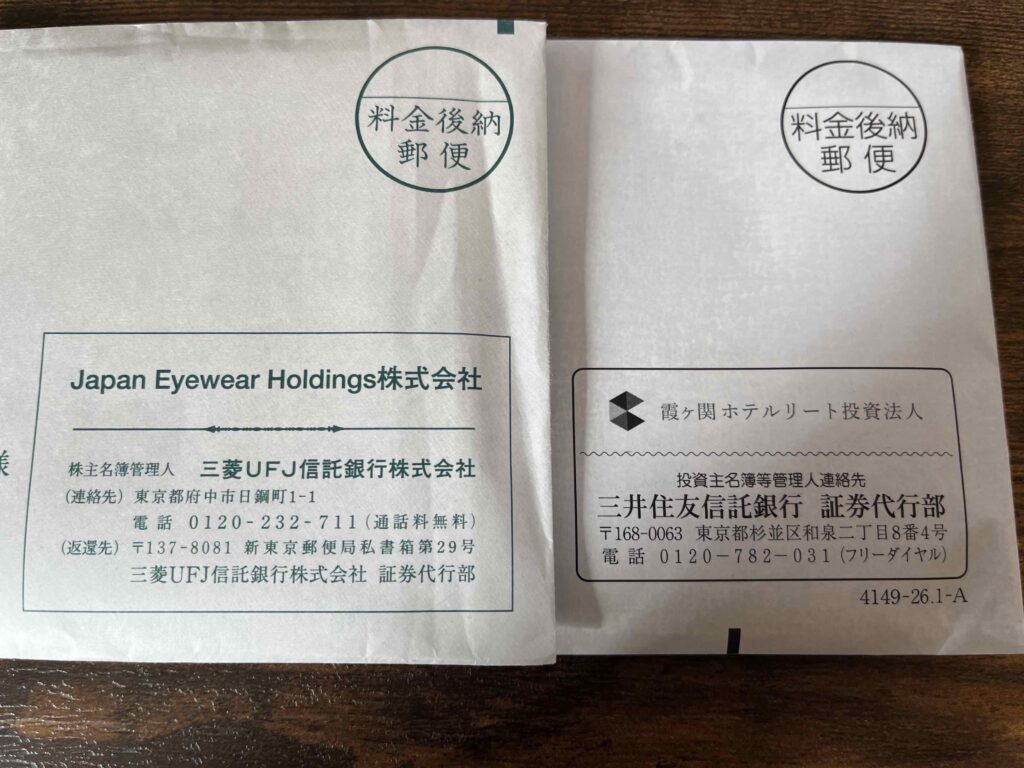 「Japan Eyewear Holdings(5889)」と「霞ヶ関ホテルリート投資法人(401A)」から議決権行使の通知が届きました。