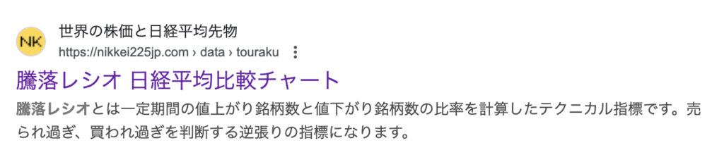 騰落レシオの調べ方として一番簡単な方法は、インターネットで「騰落レシオ」と検索し、おそらく一番上に出てくるこちらのサイトを見ることです。