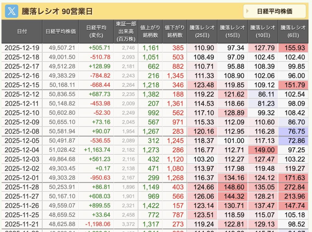 騰落レシオを活用することで、今の相場が「熱くなっているのか」「冷え込んでいるのか」を感覚的につかみやすくなります。