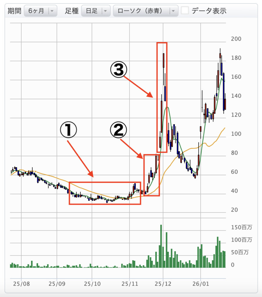 ※因みに、チャート内「③」の1ヶ月後くらいに株価が急騰していますが、これは好材料が発表されたためです。