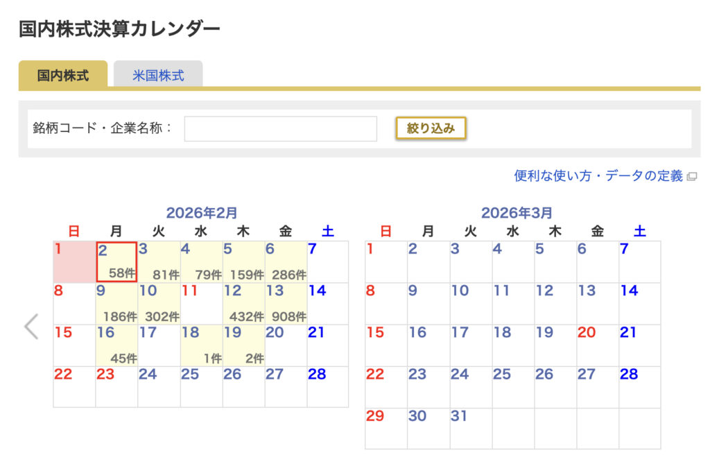 このように、決算発表日がカレンダーで管理されており、非常に便利です。また、銘柄名や銘柄コードから検索することもできます。