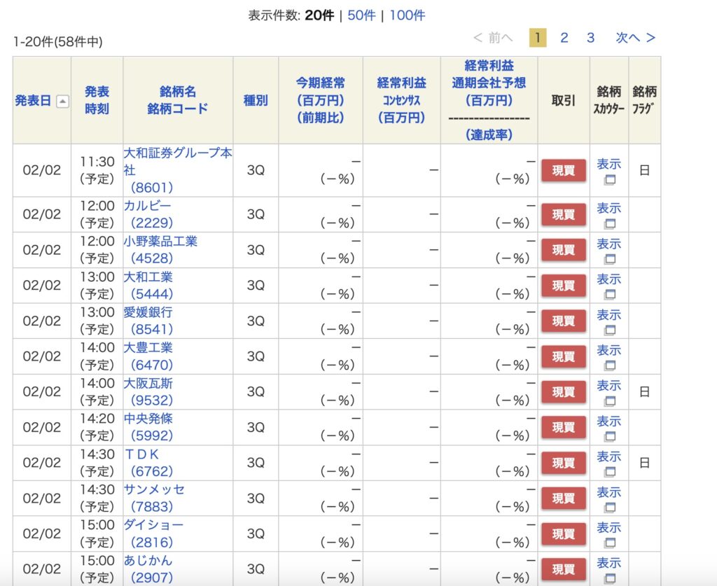 決算発表の予定時刻まで確認できるのがいいですね!