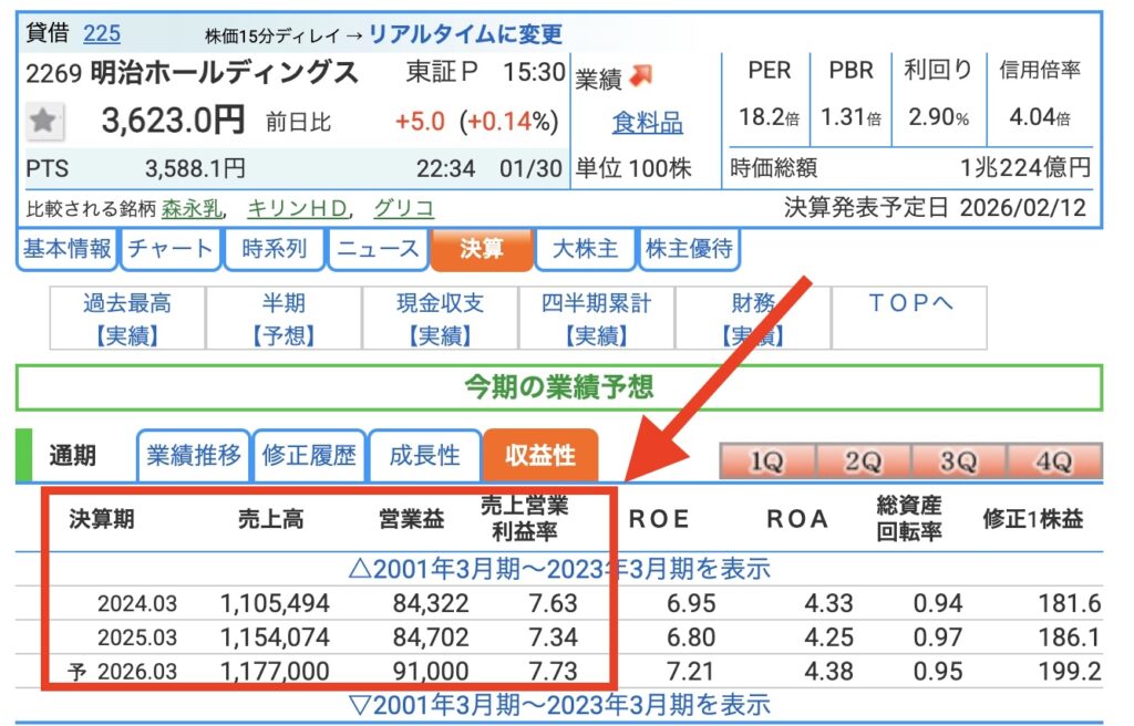 こちらは明治ホールディングスの内容です。2026年3月期の業績予想2025年3月期の実績を比較すると、売上高・営業利益・営業利益率の全てが伸びていることが確認できます。