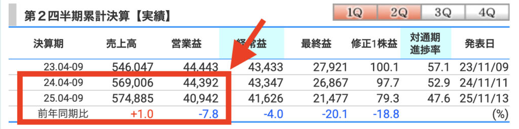 2026年3月期の第2四半期(2025年4月から9月)までの実績と、前年同期(2024年4月から9月)の実績を比較すると、売上高は伸びているものの、営業利益が減少してしまっていることが分かります。