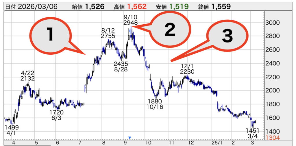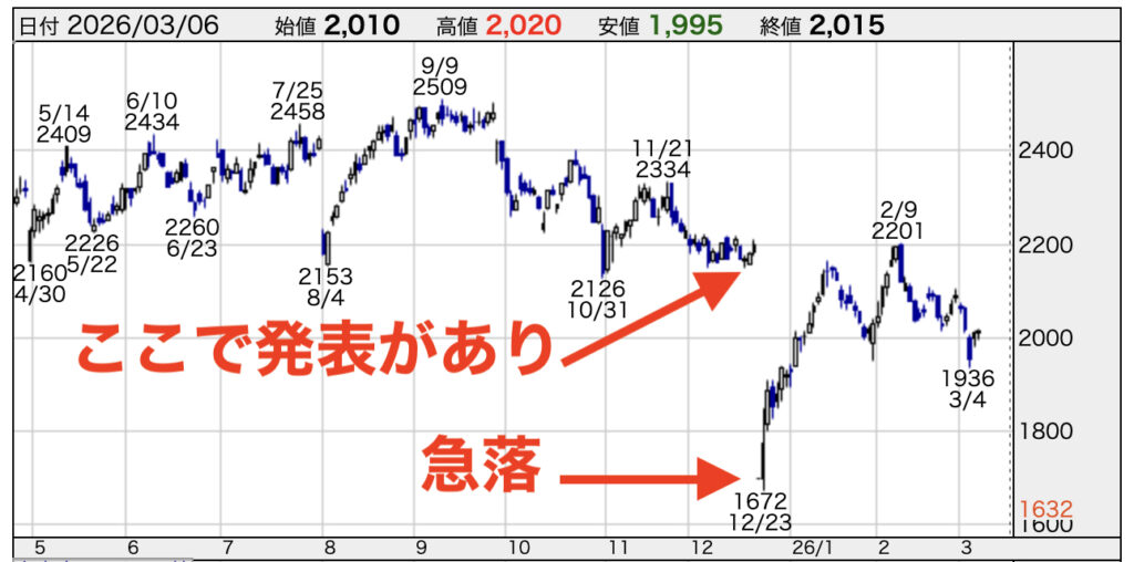 このようなケースでは、株価下落は単なる調整ではなく、企業価値の見直しになります。