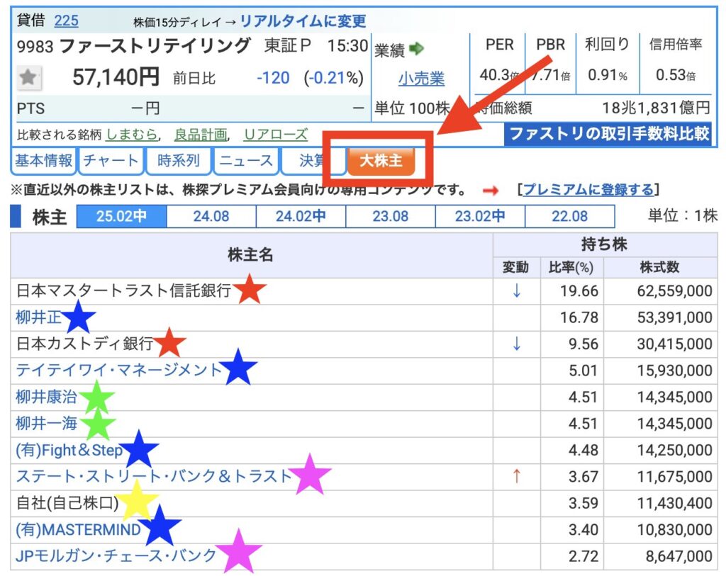 株探の「大株主」のタブから閲覧できます(赤い矢印)。