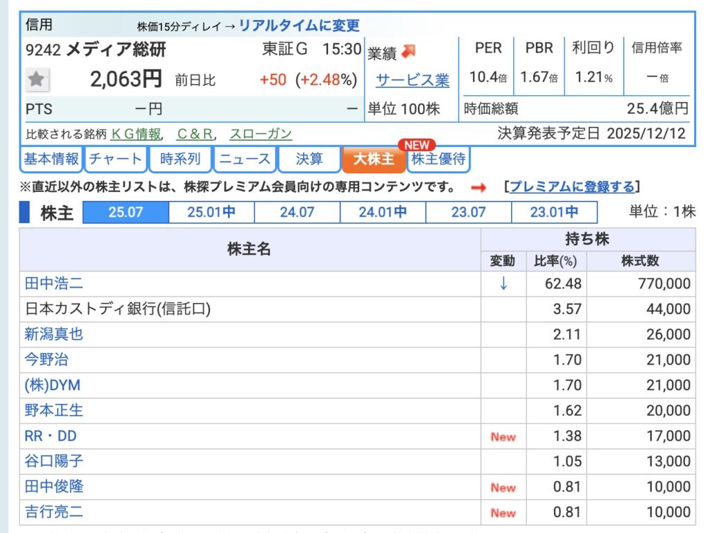 この会社がワンマン経営だというわけではありませんが、メディア総研(9242)は創業者が62%以上も株式を保有しています。時価総額が約25億円の小型株です。