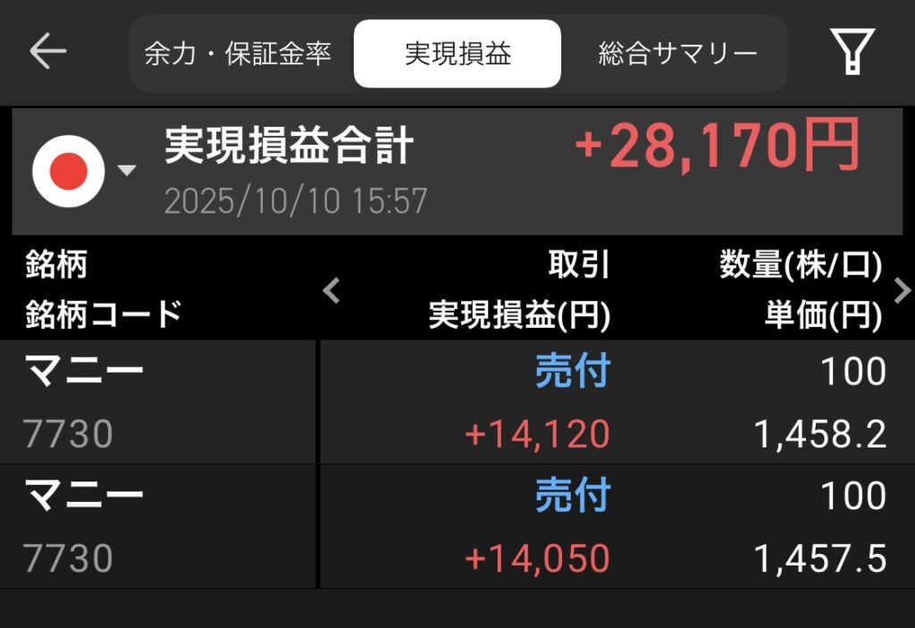 好決算で急騰したマニー(7730)で利益を出せました。あと100株残してあるのですが、休み明けの火曜日は下げるだろうなぁ😂