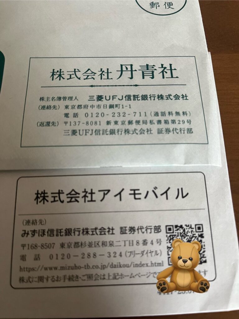 丹青社とアイモバイルからの配当金通知です。どちらも1株しか持っていないのに封筒が届くため、申し訳ない気持ちになります。